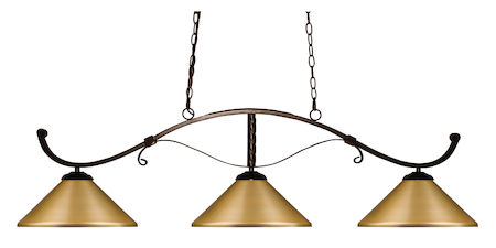 Simple yet versatile detailing and understated curve motifs define this beautiful three light fixture. Finished in bronze and paired with satin gold metal shades, this three light fixture would be equally at home in the game room, or anywhere else in the house needing a touch of timeless charm.72 inches of chain per side is included to ensure the perfect hanging height.