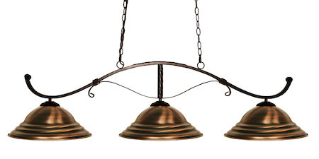 Simple yet versatile detailing and understated curve motifs define this beautiful three light fixture. Finished in bronze and paired with stepped antique copper metal shades, this three light fixture would be equally at home in the game room, or anywhere else in the house needing a touch of timeless charm.72 inches of chain per side is included to ensure the perfect hanging height.