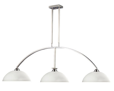 Art deco inspired detailing defines this beautiful three light fixture. Finished in brushed nickel and paired with dome mottle opal shades, this three light fixture would be equally at home in the game room, or anywhere else in the house needing a touch of timeless charm. Adjustable rods are included to ensure the perfect hanging height.