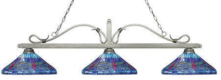 This contemporary three light fixture will complement any decor from traditional living spaces to modern game rooms. Finished in Antique Silver and paired with three multi-coloured tiffany shades this fixture exudes a timeless class perfect for all of your lighting needs.
