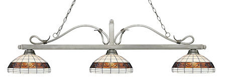 This contemporary three light fixture will complement any decor from traditional living spaces to modern game rooms. Finished in Antique Silver and paired with three multi-coloured tiffany shades this fixture exudes a timeless class perfect for all of your lighting needs.