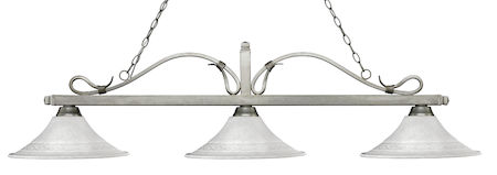 This contemporary three light fixture will complement any decor from traditional living spaces to modern game rooms. Finished in Antique Silver and paired with Fluted White Mottle glass shades this fixture exudes a timeless class perfect for all of your lighting needs.