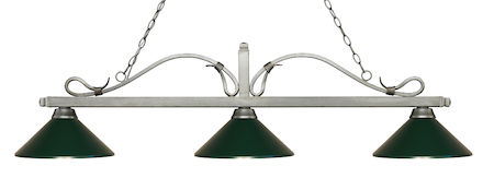 This contemporary three light fixture will complement any decor from traditional living spaces to modern game rooms. Finished in Antique Silver and paired with Dark Green metal shades this fixture exudes a timeless class perfect for all of your lighting needs.