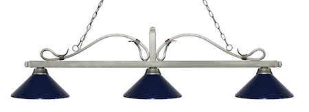 This contemporary three light fixture will complement any decor from traditional living spaces to modern game rooms. Finished in Antique Silver and paired with Navy Blue metal shades this fixture exudes a timeless class perfect for all of your lighting needs.