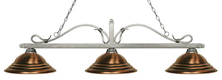 This contemporary three light fixture will complement any decor from traditional living spaces to modern game rooms. Finished in Antique Silver and paired with Stepped Antique Copper metal shades this fixture exudes a timeless class perfect for all of your lighting needs.