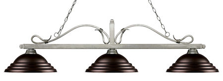 This contemporary three light fixture will complement any decor from traditional living spaces to modern game rooms. Finished in Antique Silver and paired with Stepped Bronze shades this fixture exudes a timeless class perfect for all of your lighting needs.