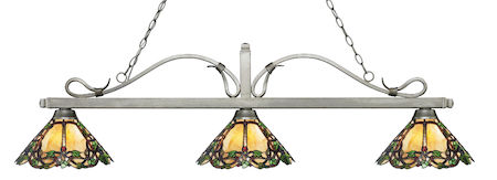 This contemporary three light fixture will complement any decor from traditional living spaces to modern game rooms. Finished in Antique Silver and paired with three multi-coloured tiffany shades this fixture exudes a timeless class perfect for all of your lighting needs.