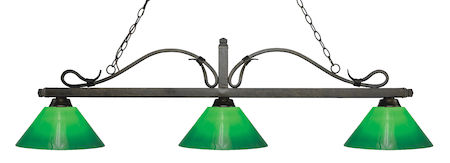 This contemporary three light fixture will complement any decor from traditional living spaces to modern game rooms. Finished in Golden Bronze and paired with Green Cased glass shades this fixture exudes a timeless class perfect for all of your lighting needs.