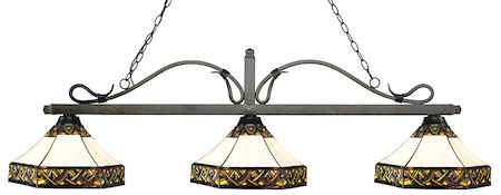 This contemporary three light fixture will complement any decor from traditional living spaces to modern game rooms. Finished in Golden Bronze and paired with three multi-coloured tiffany shades this fixture exudes a timeless class perfect for all of your lighting needs.
