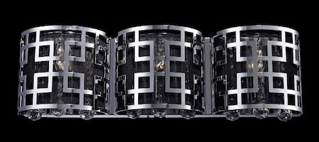The chrome outer cage of this three light vanity uses boldly modern geographic styling to create a clean and contemporary look. The inner shade is made up of black string, which subdues the light and creates a lovely contrast with the glimmering crystal.
