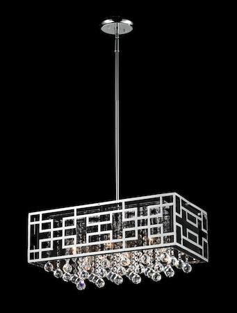 The steel outer shell of this fixture uses unique geometric patterns to create a stunning modern look, while the inner black string shade subdues the light, creating a warm glow. Complimenting this contemporary look are glittering strung crystals, which sparkle and shine against the chrome hardware. Adjustable rods are included to ensure the perfect hanging height.
