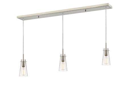 This beautiful three light fixture combines vintage design and modern elements to deliver a transitional style. Clear seedy glass is paired with a brushed nickel finish to compliment the contemporary design. This fixture would be equally striking at home over the island, or anywhere else in the house needing a touch of vintage glam.