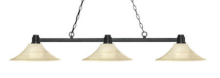 Finished in bronze this three light fixture paired with fluted golden mottle glass shades uses a low profile silhouette and straight, clean lines to create a sharp and dynamic look. This fixture would be perfect for the gameroom or any other room requiring a sophisticated touch of brilliance.