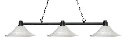 Finished in bronze this three light fixture paired with fluted white mottle glass shades uses a low profile silhouette and straight, clean lines to create a sharp and dynamic look. This fixture would be perfect for the gameroom or any other room requiring a sophisticated touch of brilliance.