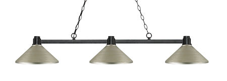 Finished in bronze this three light fixture paired with antique silver metal shades uses a low profile silhouette and straight, clean lines to create a sharp and dynamic look. This fixture would be perfect for the gameroom or any other room requiring a sophisticated touch of brilliance.