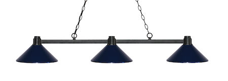 Finished in bronze this three light fixture paired with navy blue metal shades uses a low profile silhouette and straight, clean lines to create a sharp and dynamic look. This fixture would be perfect for the gameroom or any other room requiring a sophisticated touch of brilliance.