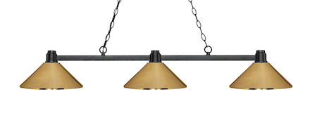 Finished in bronze this three light fixture paired with polished brass metal shades uses a low profile silhouette and straight, clean lines to create a sharp and dynamic look. This fixture would be perfect for the gameroom or any other room requiring a sophisticated touch of brilliance.