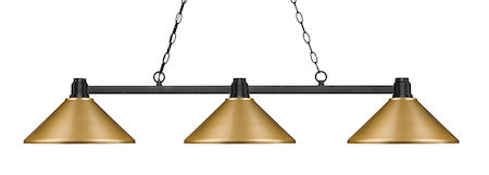 Finished in bronze this three light fixture paired with satin gold shades uses a low profile silhouette and straight, clean lines to create a sharp and dynamic look. This fixture would be perfect for the gameroom or any other room requiring a sophisticated touch of brilliance.