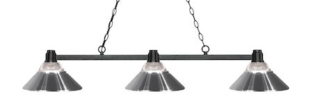 Finished in bronze this three light fixture paired with clear ribbed glass and chrome metal shades uses a low profile silhouette and straight, clean lines to create a sharp and dynamic look. This fixture would be perfect for the gameroom or any other room requiring a sophisticated touch of brilliance.