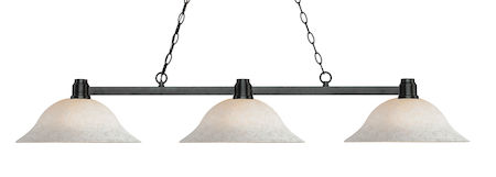 Finished in bronze this three light fixture paired with white mottle glass shades uses a low profile silhouette and straight, clean lines to create a sharp and dynamic look. This fixture would be perfect for the gameroom or any other room requiring a sophisticated touch of brilliance.