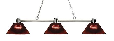Finished in brush nickel this three light fixture paired with burgandy acrylic shades uses a low profile silhouette and straight, clean lines to create a sharp and dynamic look. This fixture would be perfect for the gameroom or any other room requiring a sophisticated touch of brilliance.