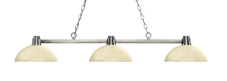 Finished in brush nickel this three light fixture paired with dome golden mottle glass shades uses a low profile silhouette and straight, clean lines to create a sharp and dynamic look. This fixture would be perfect for the gameroom or any other room requiring a sophisticated touch of brilliance.