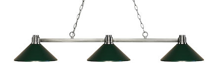 Finished in brush nickel this three light fixture paired with dark green metal shades uses a low profile silhouette and straight, clean lines to create a sharp and dynamic look. This fixture would be perfect for the gameroom or any other room requiring a sophisticated touch of brilliance.