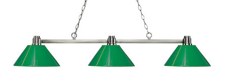 Finished in brush nickel this three light fixture paired with green plastic shades uses a low profile silhouette and straight, clean lines to create a sharp and dynamic look. This fixture would be perfect for the gameroom or any other room requiring a sophisticated touch of brilliance.