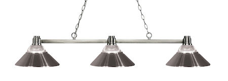 Finished in brush nickel this three light fixture paired with clear ribbed glass and brushed nickel metal shades uses a low profile silhouette and straight, clean lines to create a sharp and dynamic look. This fixture would be perfect for the gameroom or any other room requiring a sophisticated touch of brilliance.
