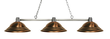 Finished in brush nickel this three light fixture paired with stepped antique copper shades uses a low profile silhouette and straight, clean lines to create a sharp and dynamic look. This fixture would be perfect for the gameroom or any other room requiring a sophisticated touch of brilliance.