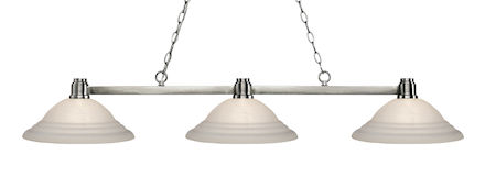 Finished in brush nickel this three light fixture paired with white swirl glass shades uses a low profile silhouette and straight, clean lines to create a sharp and dynamic look. This fixture would be perfect for the gameroom or any other room requiring a sophisticated touch of brilliance.