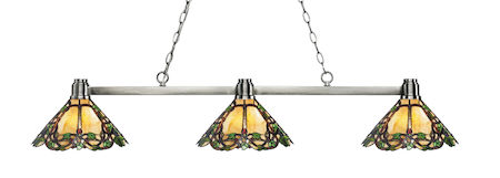 Finished in brush nickel this three light fixture paired with multi-coloured tiffany glass shades uses a low profile silhouette and straight, clean lines to create a sharp and dynamic look. This fixture would be perfect for the gameroom or any other room requiring a sophisticated touch of brilliance.