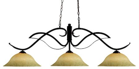 Bold flowing curves define this three light fixture. Finished in bronze, this fixture uses warm glowing gold mottle glass shades to create a contemporary, yet classic look. This fixture includes 72’’ of chain on both sides to ensure a perfect hanging height.