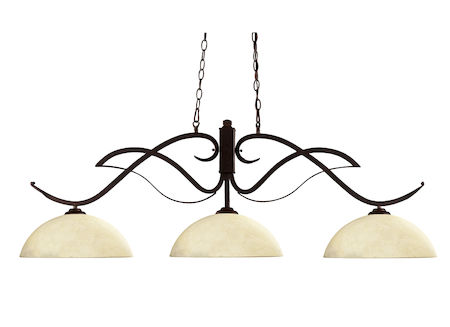 Bold flowing curves define this three light fixture. Finished in bronze, this fixture uses dome golden mottle glass shades to create a contemporary, yet classic look. This fixture includes 72’’ of chain on both sides to ensure a perfect hanging height.