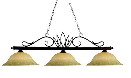 Simple curves and a crown centerpiece define this three light fixture. Finished in weathered bronze, this fixture uses warm glowing golden mottle glass shades to create an elegant look. This fixture includes 72’’ of chain on both sides to ensure a perfect hanging height.