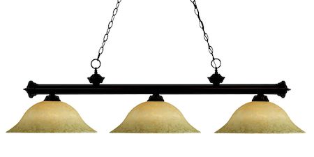 Traditional charm defines this three light fixture. The bar is finished in oil rubbed bronze, and is paired beautifully with three gold mottle shades, for a warm and inviting glow. Decorative finials complete this classic look, and 72’’ of chain is supplied on each side of the fixture, that hangs from an oval canopy. This fixture will bring a traditional and inviting look to wherever it is hung.