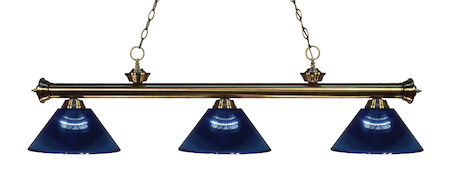 Finished in antique brass this three light bar fixture uses acrylic dark blue shades to create a contemporary look with a timeless quality to it. This fixture would be perfect for the game room, or any other room of the house where a touch of under stated sophistication is needed.
