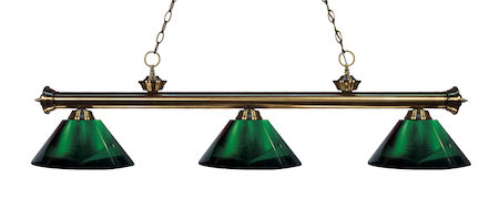 Finished in antique brass this three light bar fixture uses acrylic green shades to create a contemporary look with a timeless quality to it. This fixture would be perfect for the game room, or any other room of the house where a touch of under stated sophistication is needed.
