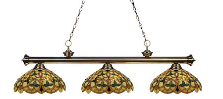 Elegant and traditional best describes this beautiful three light fixture. Finished in antique brass and paired with decorative tiffany glass shades, this three light fixture would be equally at home in the game room, or anywhere else in the house needing a touch of timeless charm. 72 inches of chain per side is included to ensure a perfect hanging height.