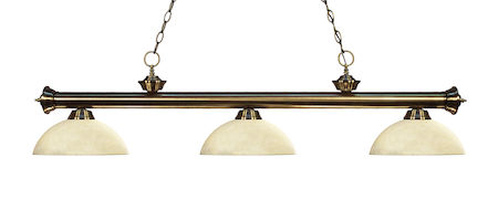 Elegant and traditional best describes this beautiful three light fixture. Finished in antique brass and paired with dome golden mottle glass shades, this three light fixture would be equally at home in the game room, or anywhere else in the house needing a touch of timeless charm.