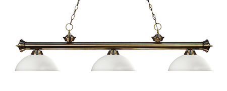 Elegant and traditional best describes this beautiful three light fixture. Finished in antique brass and paired with dome matte opal glass shades, this three light fixture would be equally at home in the game room, or anywhere else in the house needing a touch of timeless charm.