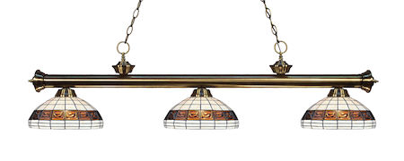 Traditional charm defines this three light fixture. The bar is finished in antique brass, and is paired beautifully with three multi colored tiffany shade for an inviting glow.
