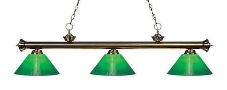 Elegant and traditional best describes this beautiful three light fixture. Finished in antique brass and paired with green cased glass shades, this three light fixture would be equally at home in the game room, or anywhere else in the house needing a touch of timeless charm.