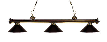 Elegant and traditional best describes this beautiful three light fixture. Finished in antique brass and paired with metal bronze shades, this three light fixture would be equally at home in the game room, or anywhere else in the house needing a touch of timeless charm