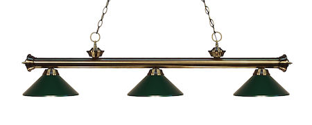 Elegant and traditional best describes this beautiful three light fixture. Finished in antique brass and paired with metal dark green shades, this three light fixture would be equally at home in the game room, or anywhere else in the house needing a touch of timeless charm