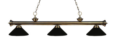 Elegant and traditional best describes this beautiful three light fixture. Finished in antique brass and paired with metal matte black shades, this three light fixture would be equally at home in the game room, or anywhere else in the house needing a touch of timeless charm