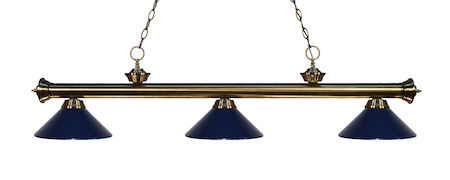 Elegant and traditional best describes this beautiful three light fixture. Finished in antique brass and paired with metal navy blue shades, this three light fixture would be equally at home in the game room, or anywhere else in the house needing a touch of timeless charm