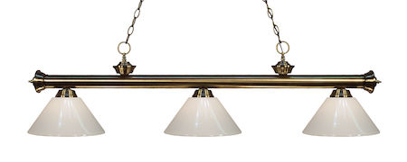 Finished in antique brass this three light bar fixture uses plastic white shades to create a contemporary look with a timeless quality to it. This fixture would be perfect for the game room, or any other room of the house where a touch of under stated sophistication is needed.