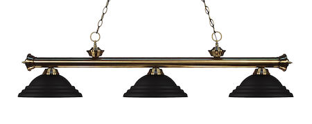 Elegant and traditional best describes this beautiful three light fixture. Finished in antique brass and paired with metal stepped matte black shades, this three light fixture would be equally at home in the game room, or anywhere else in the house needing a touch of timeless charm