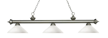 Elegant and traditional best describes this beautiful three light fixture. Finished in Antique Silver and paired with Angle Matte Opal glass shades, this three light fixture would be equally at home in the game room, or anywhere else in the house needing a touch of timeless charm.